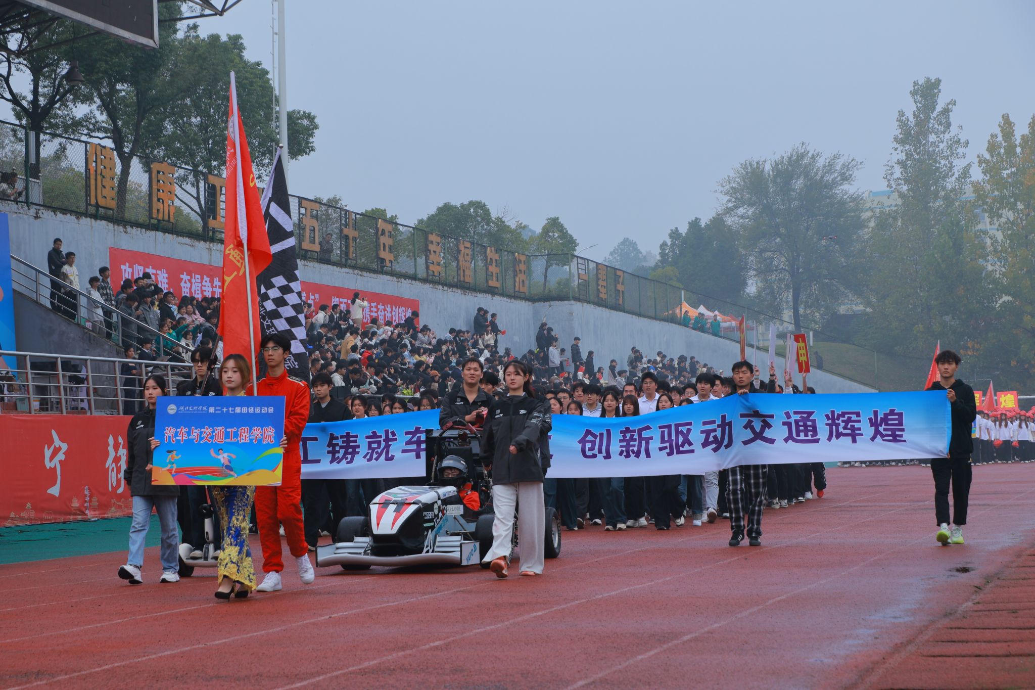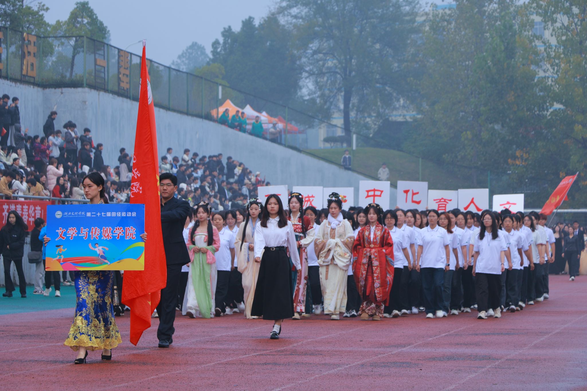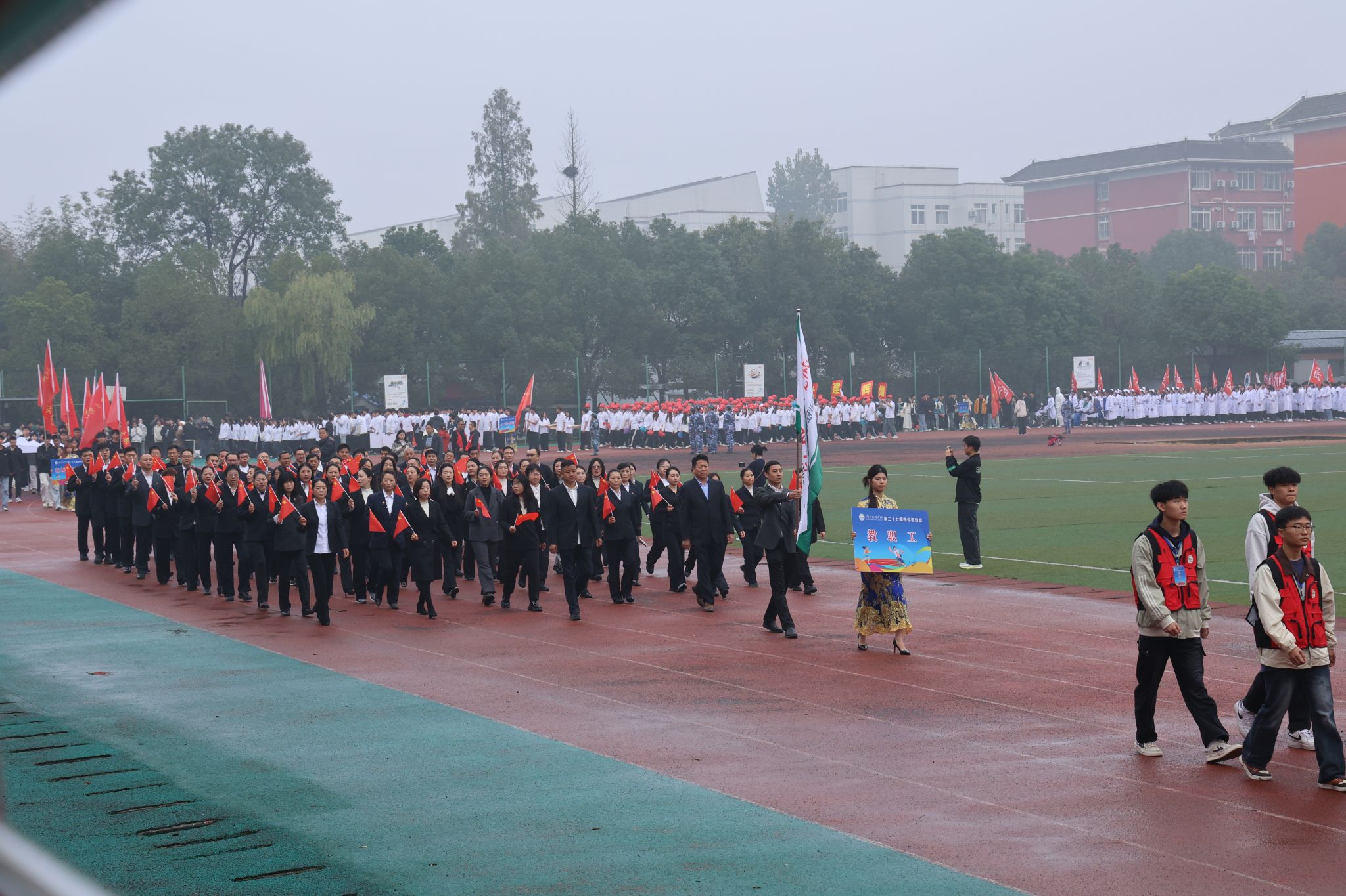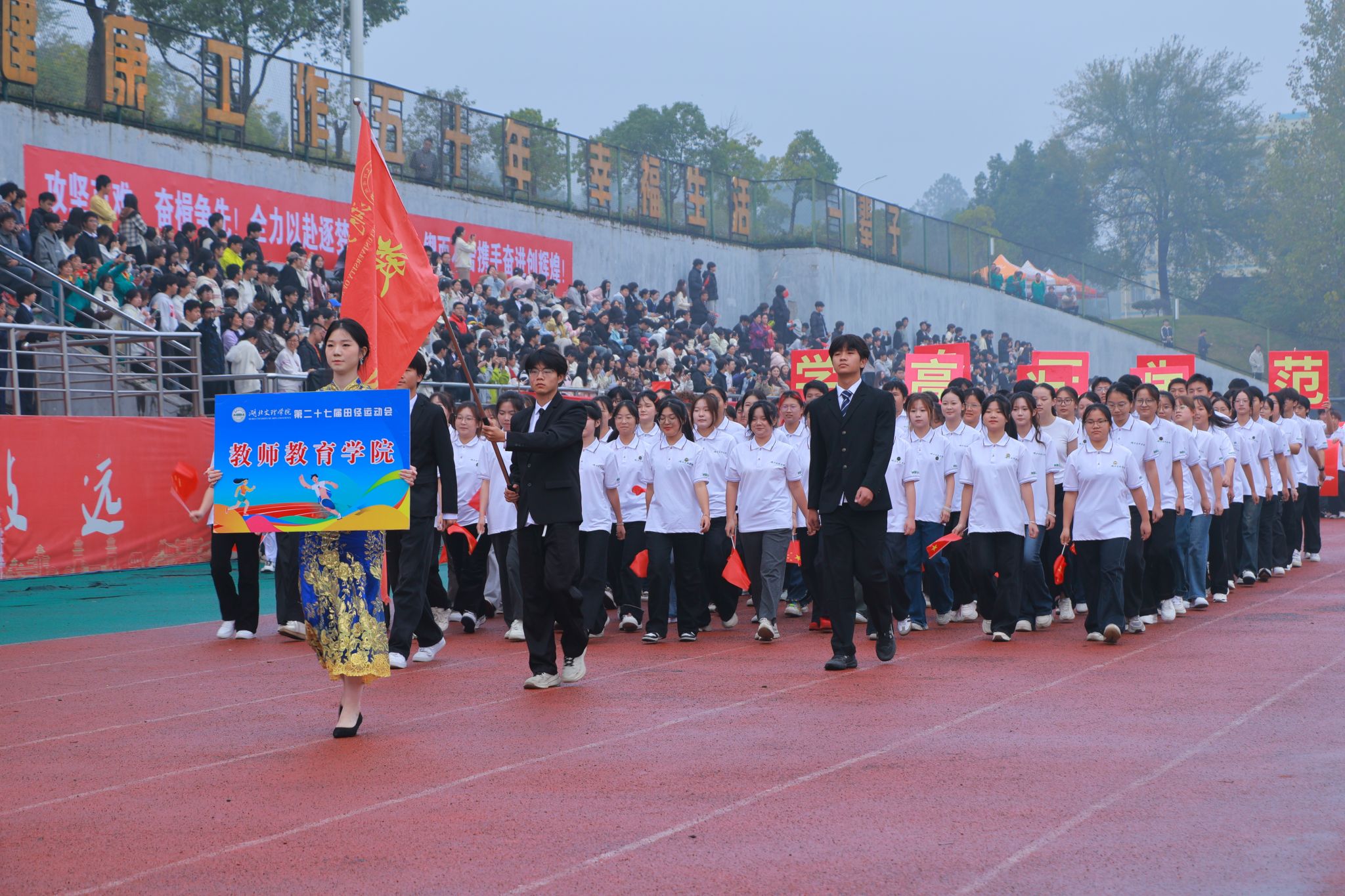 伴随着激昂的旋律,国旗队、校旗队、彩旗队、教职工方阵及各二级学院学生方阵依次走过观礼台。各方阵步伐整齐、口号嘹亮,展现出湖文师生昂扬向上的精神面貌。