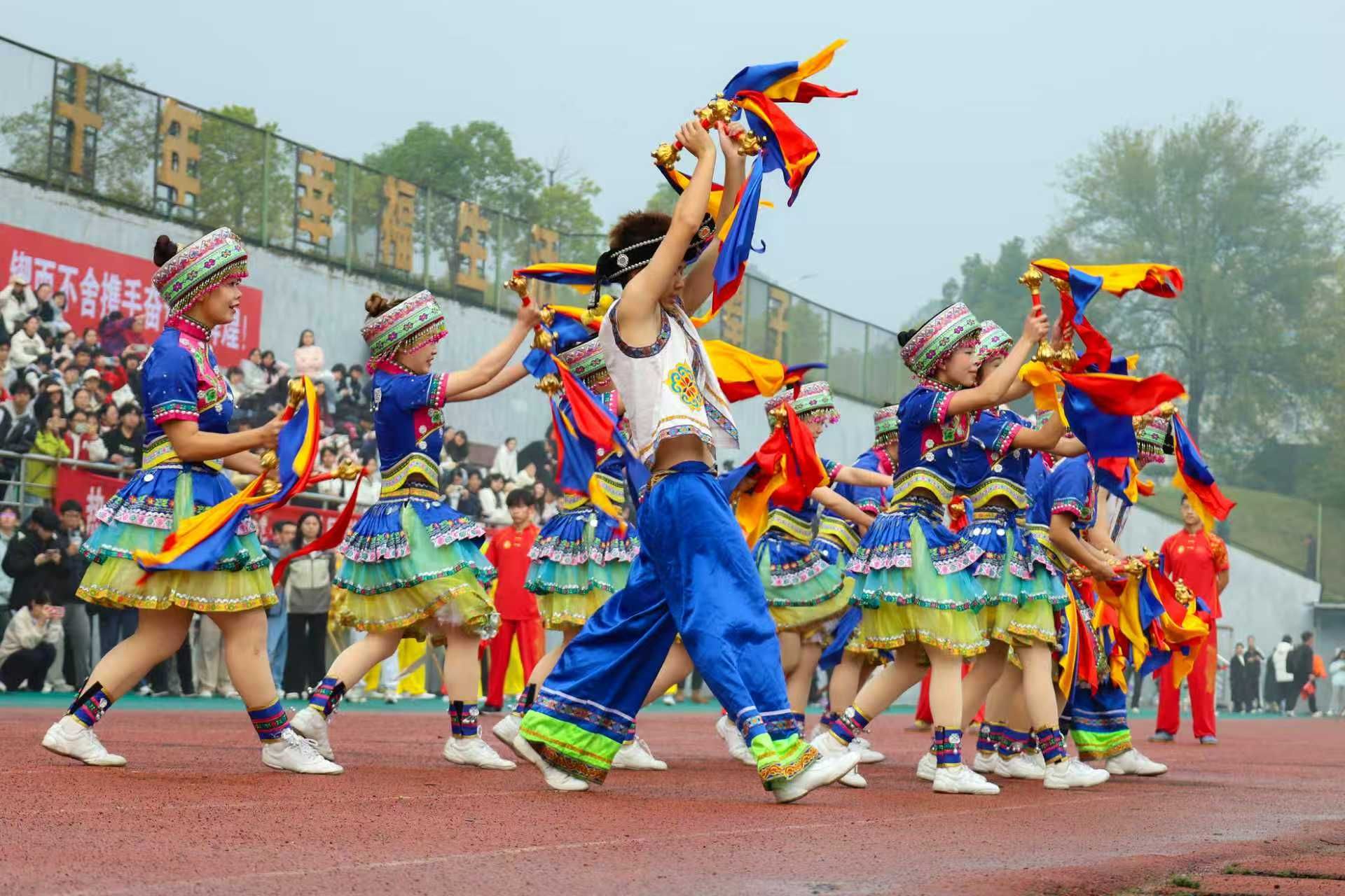 随后,开幕式表演精彩上演。民族健美操节奏动感、舞步飞扬,武术表演刚柔并济、气势如虹,舞龙翻腾跳跃、活力四射……一个个节目充分展现了湖文学子朝气蓬勃的青春风采。